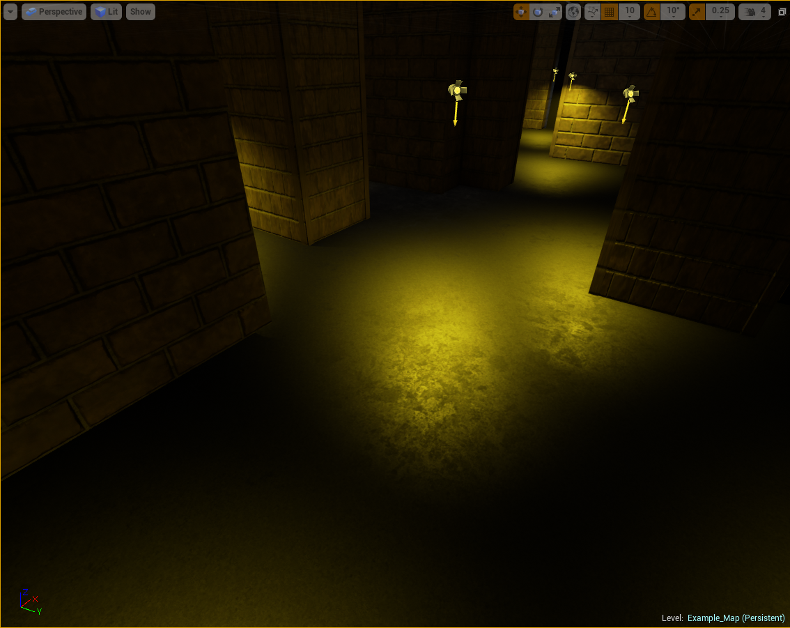 This boxed out version of the level is lacking props to populate the rooms that the player travels between. The lighting effects are also considered placeholders that simply serve to capture the idea of the level.