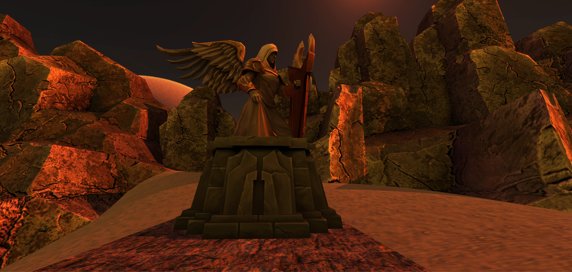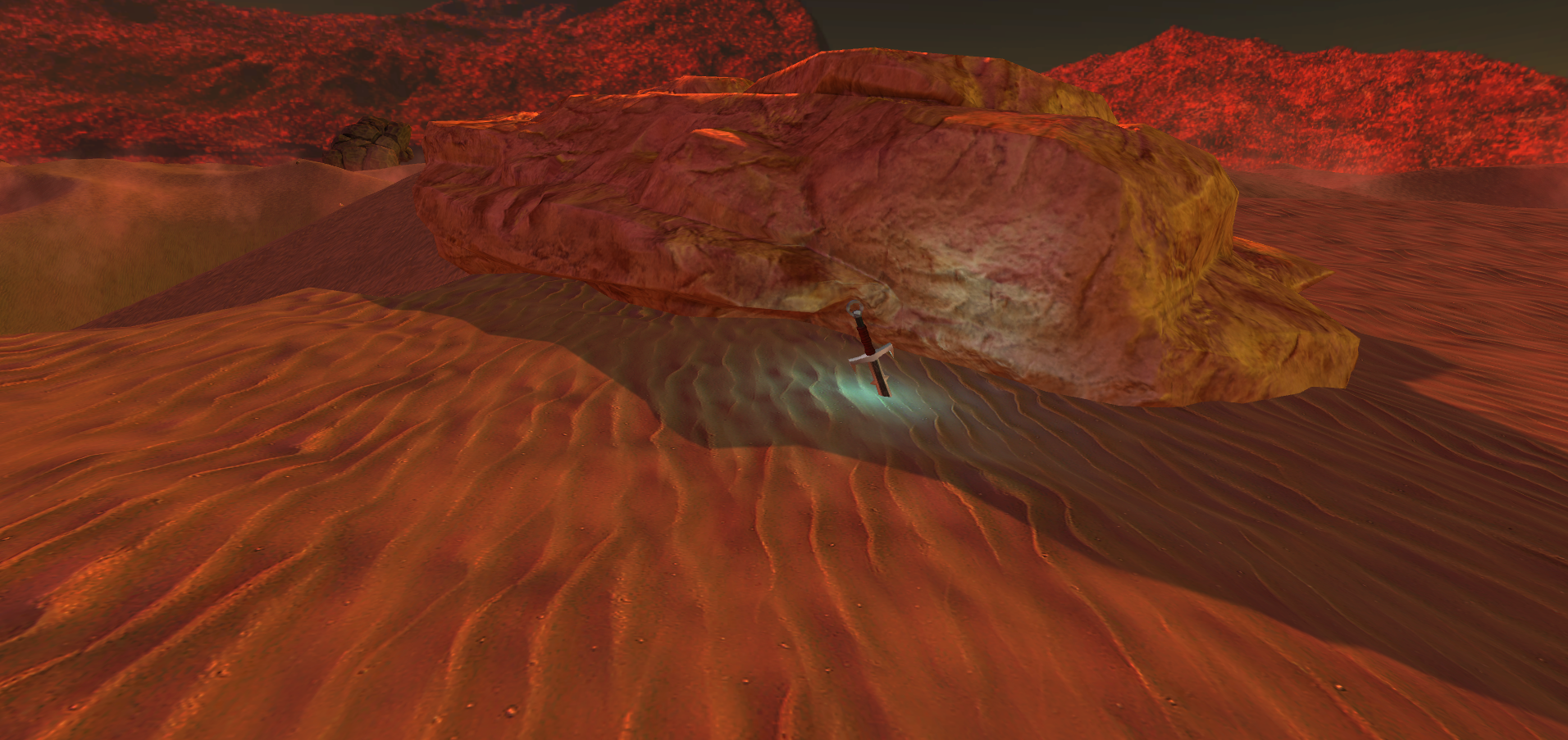 This sword is the item of interest in this environment. They need to retrieve the weapon and bring it to the altar near the cliffside in order to proceed. I tried to give the sword a glow effect that stands out from the rock and sand around it so that it stands out to the player more easily.