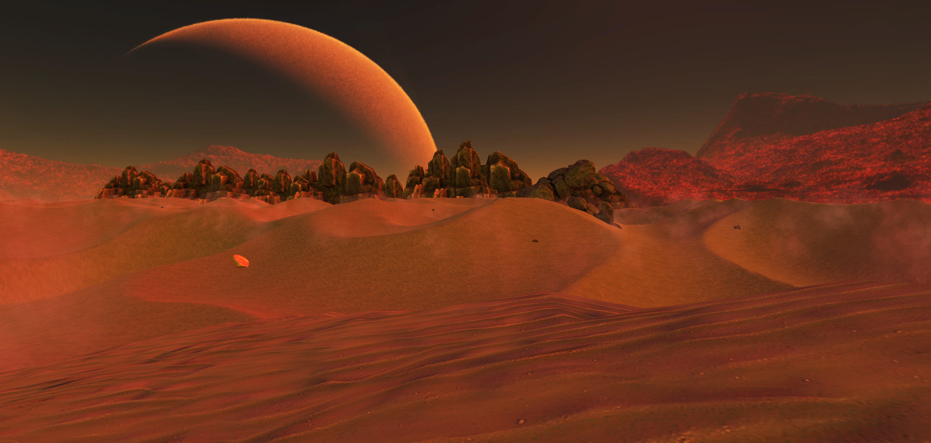 This is the point where the players spawns into the area. It is in the southeast section of the environment, one of the emptiest parts of world. The player does not have full grasp of world around them, but does have some clues to suggest where they should go next. First, there is the planet seen over the horizon between two hills. I was hoping that this image would suggest that there is more on the other side of the hill, drawing them forward to investigate. Second, there are a few rocks that lead up to the top of hill, almost like a line for the player to follow. A direct line would have been obvious and unnatural, so I only used a few scattered around. Only one can be seen in this shot, but the others are visible if the player pans left.