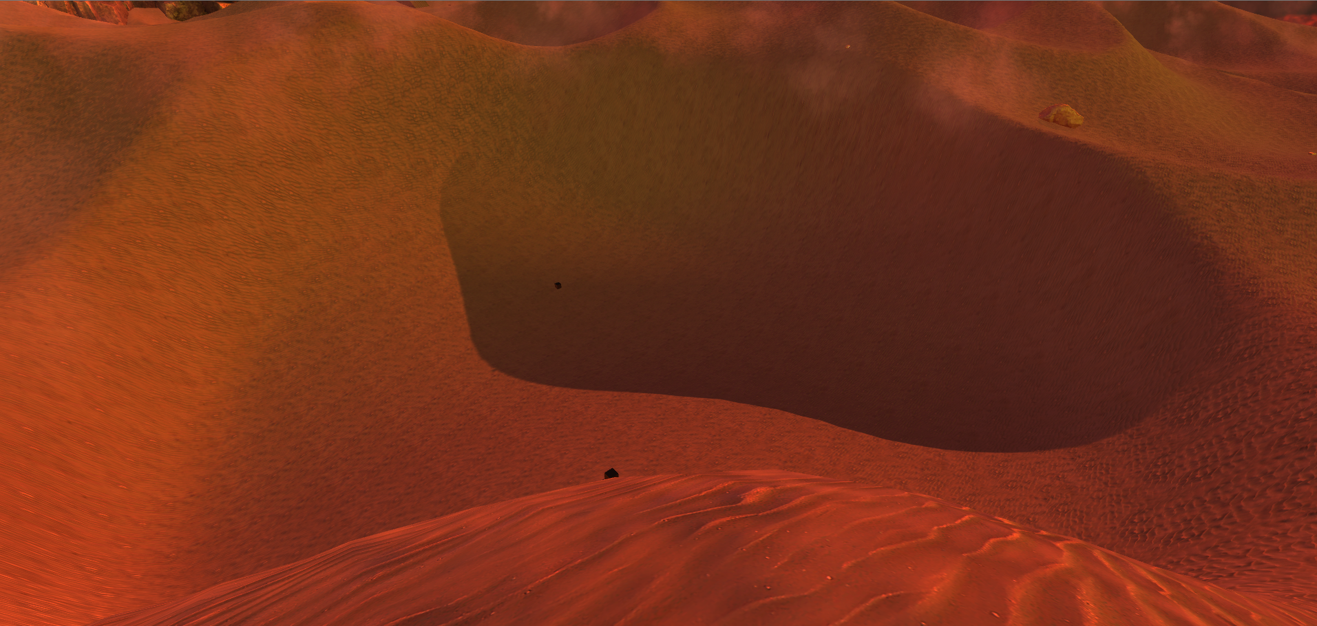 This is the player’s perspective farther away from the sword. It is difficult to see, but in the blown up image, you can faintly see this glow effect. The idea is to give the player a visual aid to help them locate the weapon rather than force them to search the entire desert and hope they stumble across it.